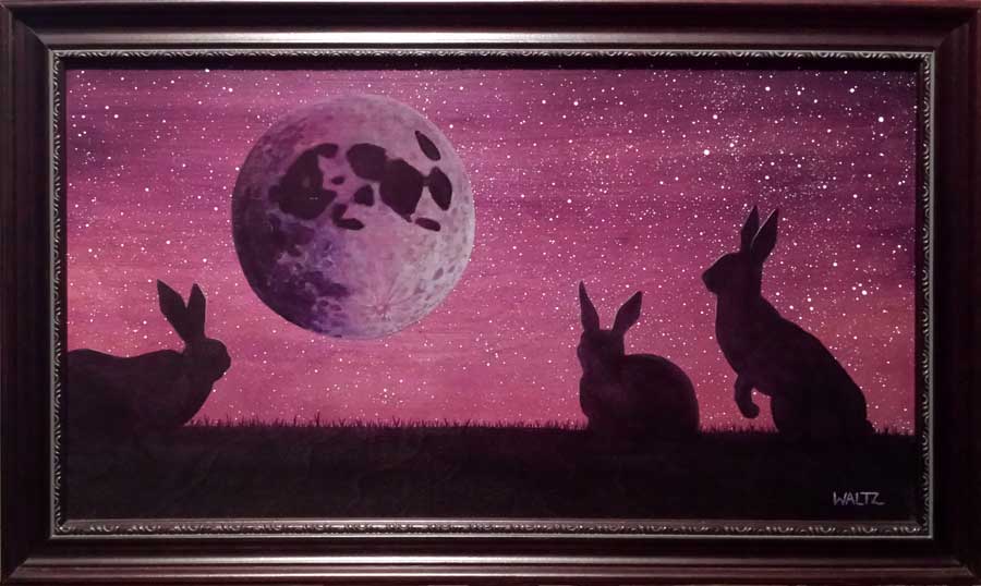 Higher Mass Cottontale Club Acrylic paint on wood panel, custom frame 17.5 x 9.75” (44.45 x 24.77cm) SOLD Prints available here